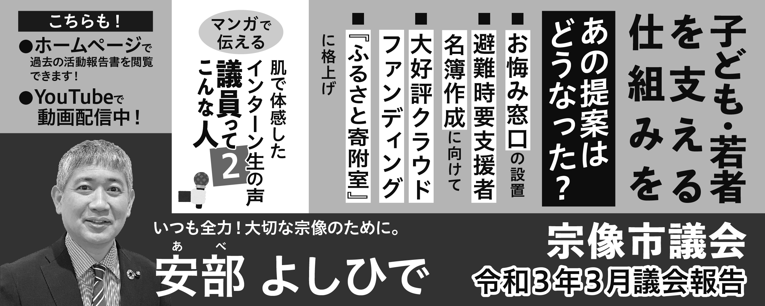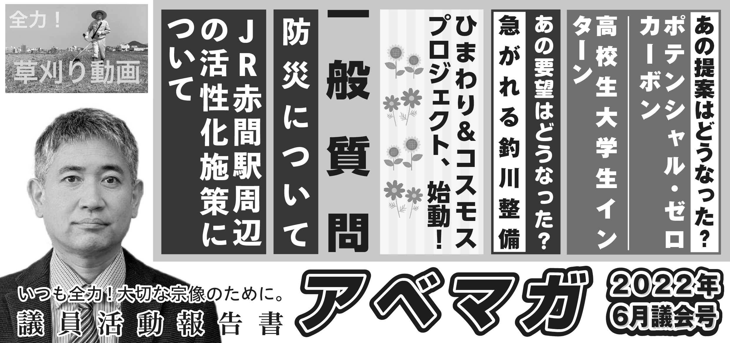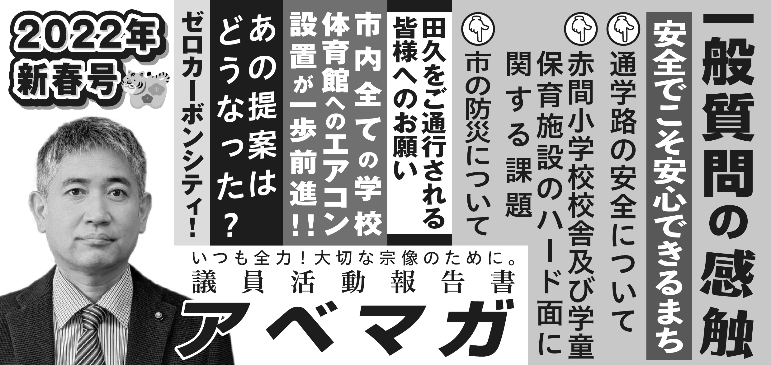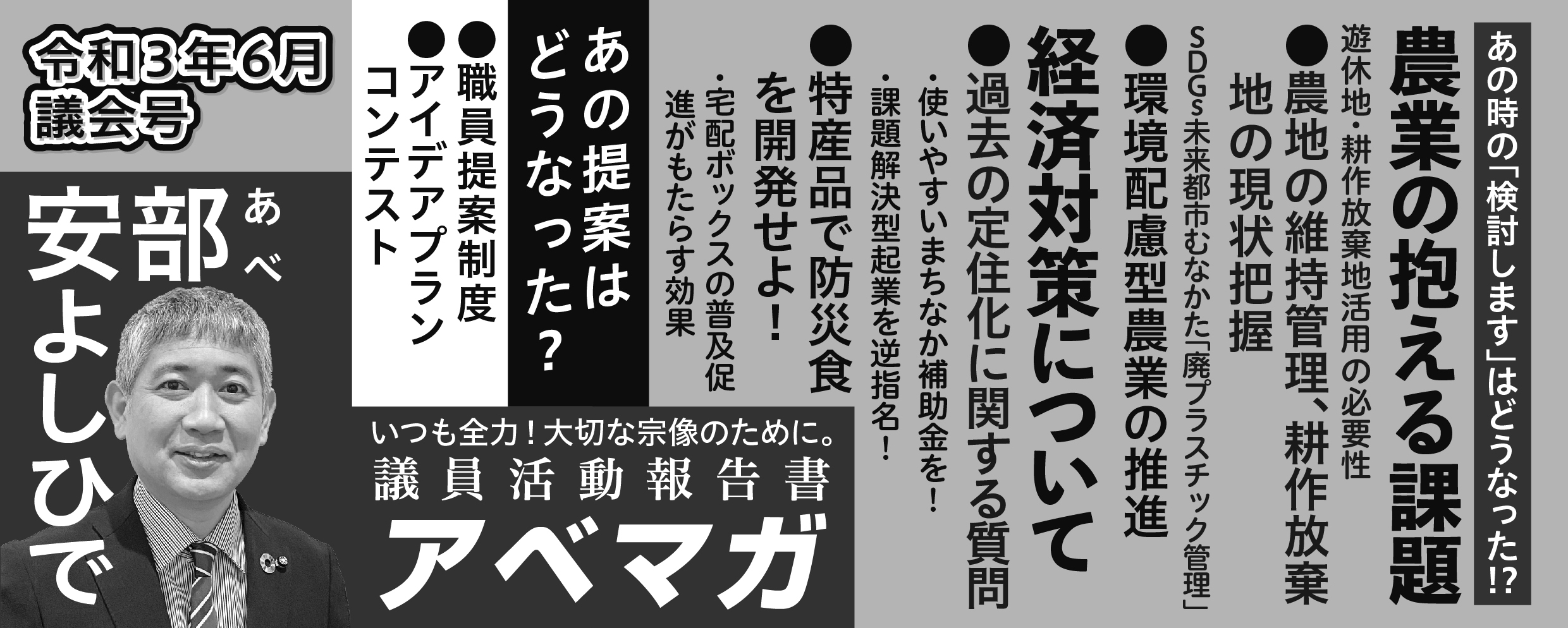 安部よしひでの活動の記録 三期目 2021-2024の活動報告のまとめは こちらから読めます! 2024年 アベマガ2024年9月12月表 アベマガ2024年9月12月裏 ☆NEW アベマガ2024年6月表 アベマガ2024年6月裏 アベマガ2024年3月表 アベマガ2024年3月裏 2023年 アベマガ2023年12月表 アベマガ2023年12月裏 アベマガ2023年9月表 アベマガ2023年9月裏 アベマガ2023年6月表 アベマガ2023年6月裏 2022年 ♦2021年 二期目 2017-2020の活動報告のまとめは こちらから読めます! 2020年 2019年 2018年 2017年 お問い合わせ お名前(必須) メール(必須) 件名 メッセージ この内容で送信しますか?(必須) 送信